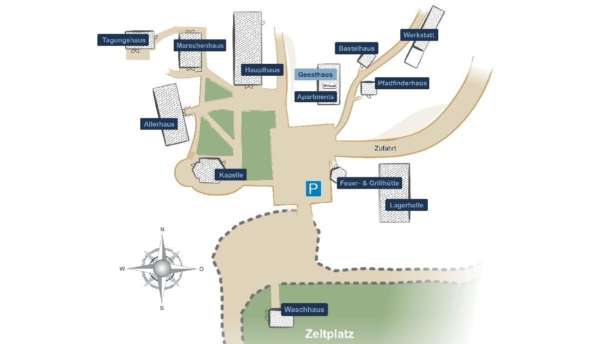 Jede Gästegruppe bewohnt, wenn möglich, ihr „eigenes“ Haus mit Einzel-/Mehrbettzimmern. Zusätzlich sind unsere Häuser mit Teeküchen, Sanitärbereichen, Aufenthaltsbereichen teilweise mit Kamin, Tischtennis, Kicker und Billard ausgestattet.